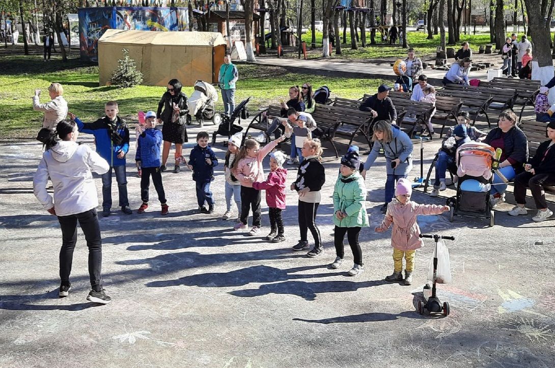 Со сцены звучали поздравительные песни, артисты подарили хореографические номера, а дети вместе с родителями участвовали в конкурсе рисунка мелом на асфальте, посвящённого Дню Победы.