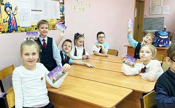Все ребята получили в подарок памятные значки и открытки с кинотеатром "Родина" от строительной группы "Рисан".