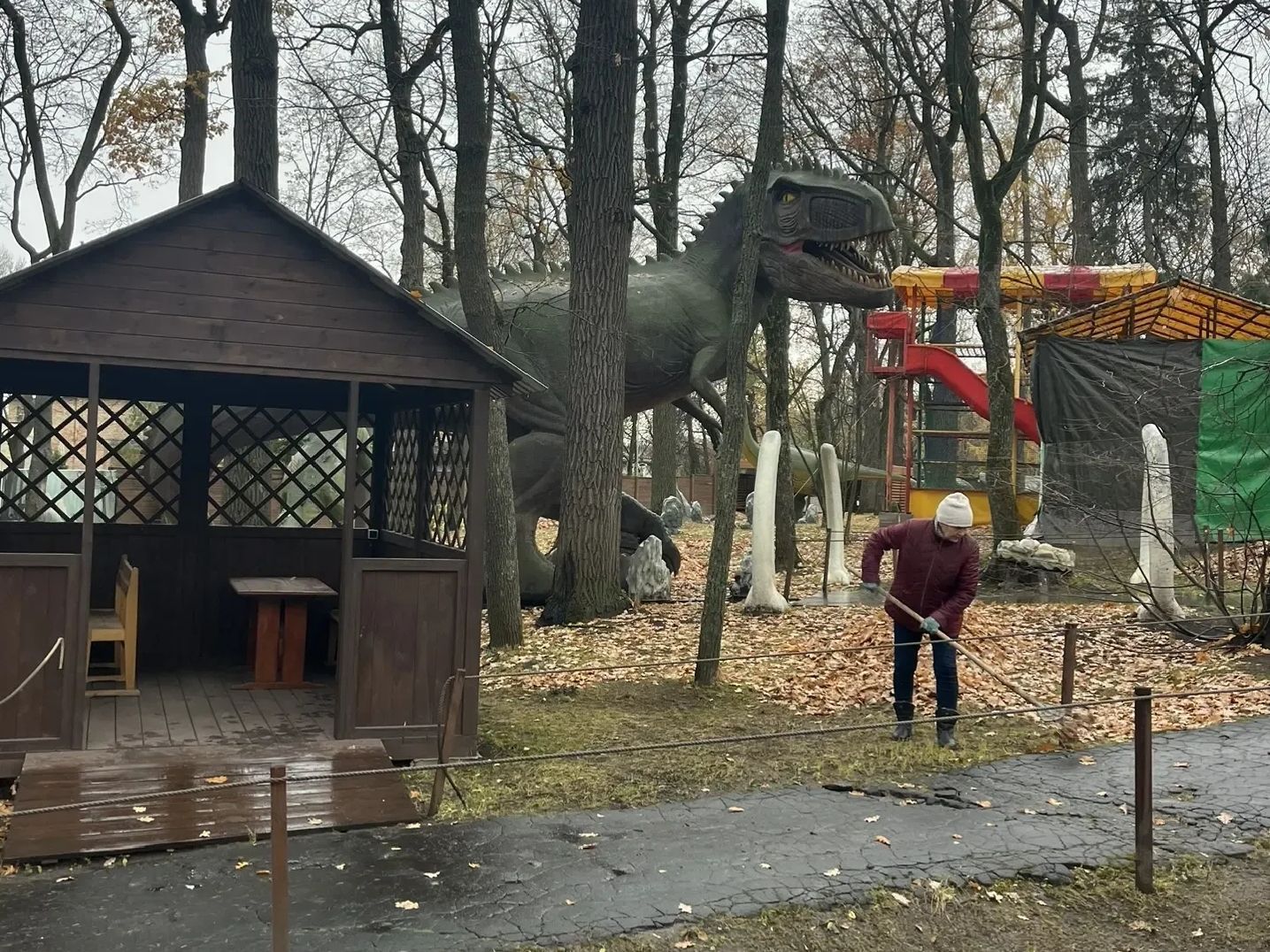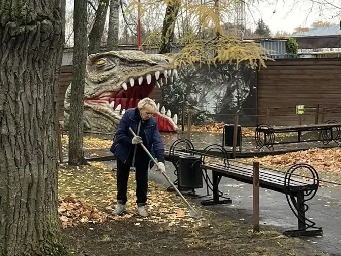 Сотрудники парков дружно вышли на уборку аллей, газонов, территории Парка динозавров.