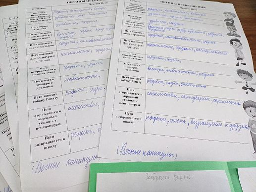 По ходу обсуждения девочки и мальчики заполняли «эмоциональный дневник» главного героя, это помогло проиллюстрировать его внутренние изменения в рамках развития сюжета.