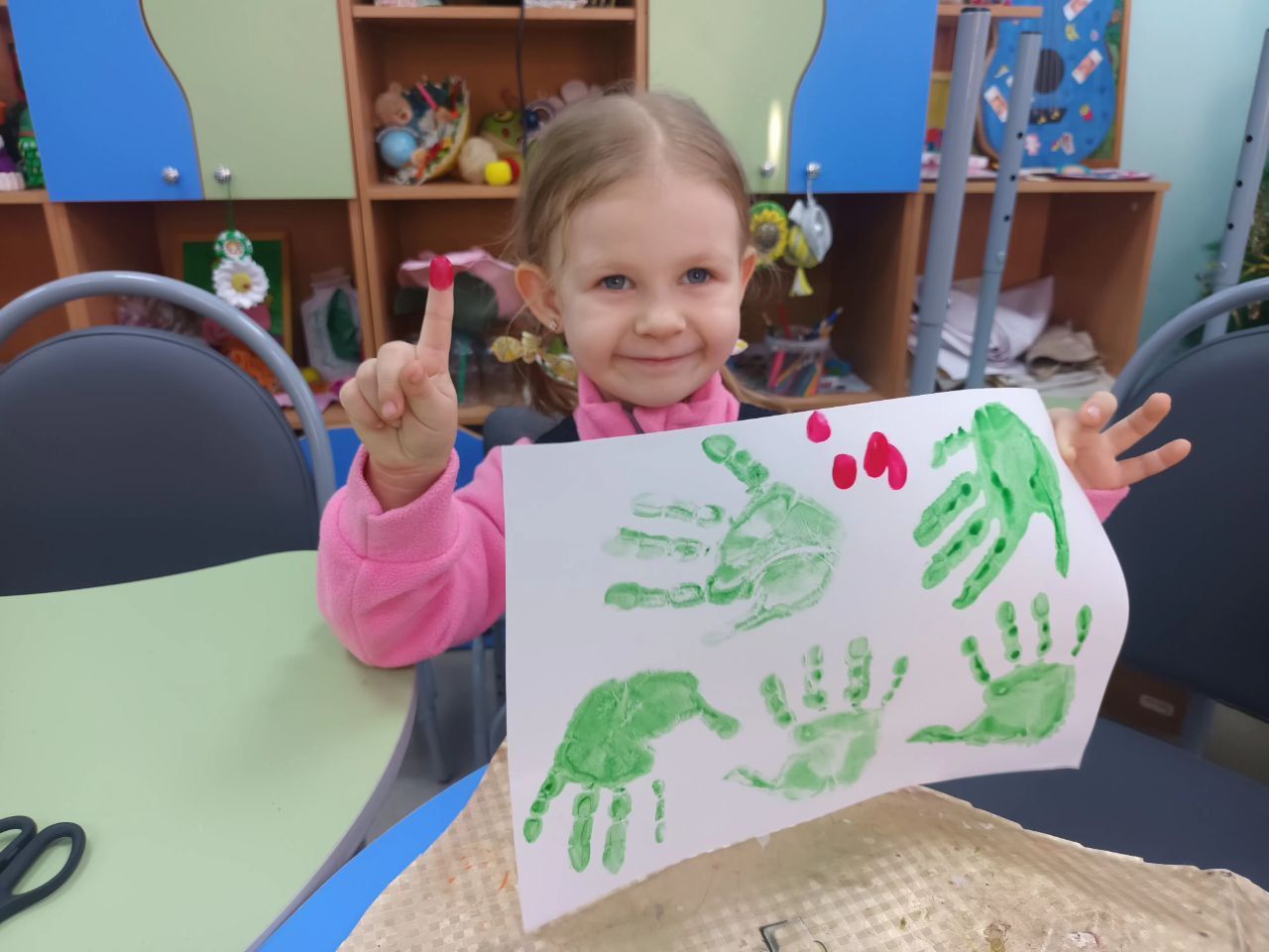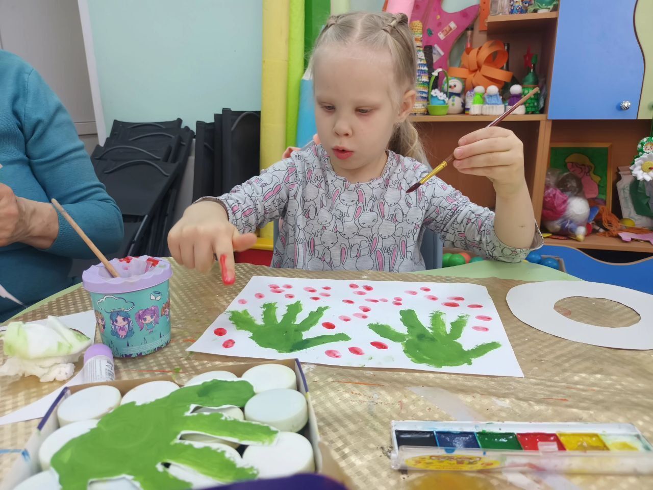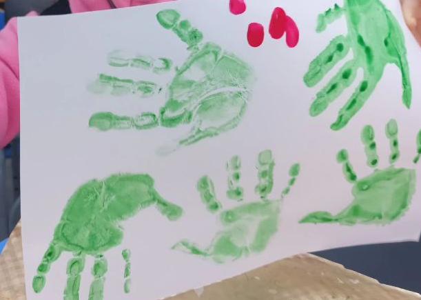 В завершение все дружно взялись за краски и, используя свои собственные ладошки, создали замечательные, душевные новогодние венки.
